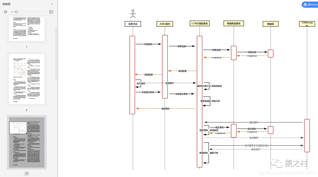 步骤介绍: 业务⽅法(开始事务) 开始事务是指参与⽅或者发起⽅开始执⾏⾃⼰的业务时开启事务操作,对应JDBC来说就需要去获取Connection连接对象,在这⼀步是将会开始访问JDBC接⼝获取连接对象。 JDBC操作(获取连接) 这⾥代表的是通过JDBC协议向连接池获取Connection连接对象的请求。 LCN代理连接池(获取连接) 这⾥是指通过LCN代理连接池继续将请求传递,向数据库连接池层获取Connection连接对象。 数据库连接池(获取连接) 这⾥是数据库连接池继续向数据库层获取连接请求传递。 LCN代理连接池(代理连接) 代理连接是指LCN将返回的连接对象创建代理对象,然后在返回给调⽤⽅。代理对象主要是为了获取 到实际要执⾏的业务操作和控制数据的“伪提交”代理控制⽅,这⾥是⼀个抽象的接⼝,⽬前代表的是关系 型数据库的代理实现。 业务⽅法(执⾏业务) 业务⽅法在执⾏业务的时候会对资源做操作,当操作资源的时候就会发送数据给LCN代理的对象。 业务⽅法(业务操作) 随着业务的操作,则将控制数据传递给了LCN代理连接池。LCN代理连接池(解析执⾏的SQL并保存起来) LCN接受到了业务⽅法的操作然后对其做业务解析操作,这⾥由于是关系型数据库,解析得到将是SQL语句。对SQL有两点主要事项:1、所有的赋值对象将通过java来赋值⽽不能直接使⽤数据库函数,就如mysql的now()函数⼀样,那么再对其做补偿业务的 情况下时,会出现记录的时间会与实际发⽣时间不⼀致的情况,就违背了幂等性;2、若是insert语句且是数据库主键⾃增类型的得需要获取到插⼊以后的主键key信息。 业务⽅法(提交事务) 业务⽅法完成了所有的业务操作,开始发起提交本地的事务提交请求。LCN代理连接池(事务伪提交,开始超时机制) LCN代理连接对象接受到提交事务请求时会阻⽌事务的提交,但是会将解析到的业务操作⽇志数据(SQL)存储到本地,再开始启⽤倒计时等待TM的消息通知,然后再返回提交成功给业务⽅法。 LCN代理连接池(响应提交) LCN代理连接池将响应完提交事务以后将结果反馈给参与业务⽅,业务⽅法再继续执⾏业务,将数据 反馈给调⽤者。TxManager(通知事务) 当接受到TM的事务通知时,则会根据事务状态做对应的事务操作。 LCN代理连接池(提交事务) 当事务提交操作时,TC则会先创建对本次操作⽇志步骤的删除操作,对应关系型数据库来说就是对记录 的业务SQL做删除操作,将该操作步骤也加⼊到待提交的本地事务中,然后⼀同与本地事务提交。当接受到的是回滚操作,那么则会将删除操作加⼊到事务中然后⼀同回滚,这样的⽅式主要是为了在事务的回滚或提交时都会将删除⽇志操作与本地事务⼀起处理。注意:在执⾏delete语句的时候会根据实际记录的⽇志数来判断是否执⾏成功,若没有执⾏成功则肯定是由于⽇志数据没有保存成功导致的影响⾏数不匹配,此时会继续保存⽇志,若2次尝试后依旧⽆法保存则直接抛出JDBC异常。当事务正在提交或回滚后也不会出现重复提交的问题,因为重复提交的执⾏⽇志已经在事务提交是清理了,仅当需要补偿的时候才会保留本地的业务⽇志数据。当执⾏提交事务出现异常的时候也会重试,若重试依旧⽆法提交事务则直接作为补偿情况,此时将返回给TM事务须补偿的状态,也将取消对本地的超时任务。 LCN代理连接池(响应事务) 当LCN事务提交以后就开始响应事务通知给TM,通知TM本次事务已经完成。 LCN代理连接池(询问事务组) 若TM⻓时间没有请求到LCN代理连接池的话,那么LCN代理连接池将会触发超时请求机制,则会主动 去联系TM,若访问不到TM,则会再重试访问⼀次请求,若还不能访问则会根据TM的集群部署特点,请求其他的TM节点,若全都访问不到,只可能是TM故障或者⽹络故障,这样的情况下LCN代理连接将执⾏回滚事务,但是不删除⽇志数据。当再次联系上TM时可检测⽇志数据请求状态再做事务提交或回滚请求。若可以联系上TM则TM会响应⼀个继续等待的消息,则TC将继续等待TM通知。因此设置TC的等待超时时间可以是短暂的,因为在询问到TM若未完成的事务或者没有通知到的事务时TM都将通知TC继续等待。当TC请求到的TM状态已经是补偿状态时,则会唤醒TM的继续请求指令,然后TC将继续进⼊计时等待状态。 LCN代理连接池(事务回滚,释放资源,开始计时) 在本体事务提交的时候,会先通过TM获取到数据排他性的全局锁,然后在执⾏本地事务的回滚操作, 然后再开始在本地事务中执⾏⽇志SQL存储提交,再执⾏定时任务计时。 LCN代理连接池(提交事务) 在TM通知事务以后将开始执⾏本地事务的提交,本地事务的提交将会查询出执⾏的SQL然后执⾏业 务,再将插⼊SQL和删除⽇志的SQL在同⼀事物中⼀同执⾏。若是回滚操作的话,则直接就是删除执⾏的SQL,这只是与强⼀致差异性的地⽅,其他操作可参考强⼀致事务流程。