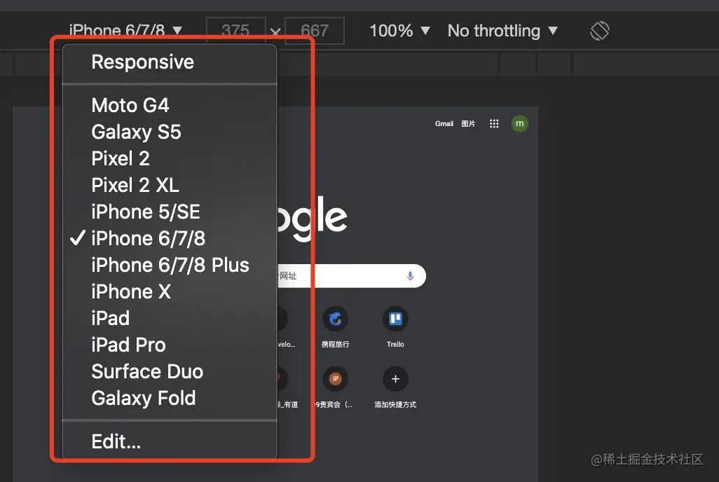 可以通过设备切换,切换不同的设备进行不同尺寸的显示,当然,如果没有你需要的设备,可以点击edit进行自定义添加