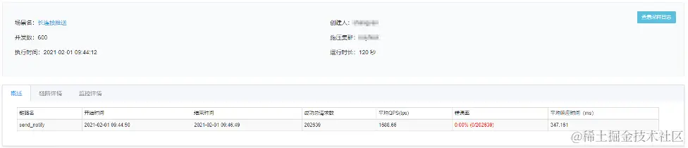 一般同一用户同时建立的长连接都在个位数。以10个长连接为例,在并发数600、持续时间120s条件下压测,推送接口的TPS大约在1600+ ,如图5所示。