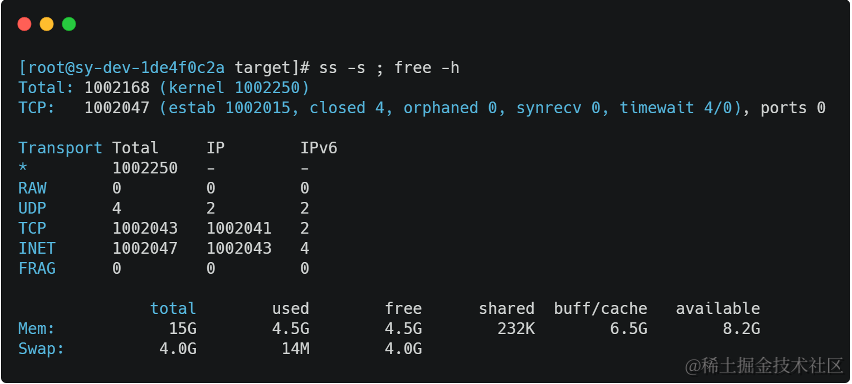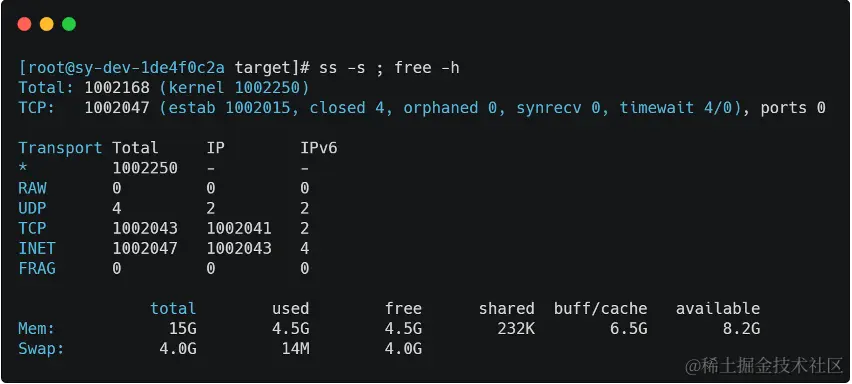 压测选择两台配置为4核16G的虚拟机,分别作为服务器和客户端。压测时选择为网关开放了20个端口,同时建立20个客户端,每个客户端使用一个服务端端口建立起5万连接,可以同时创建百万个连接。连接数与内存使用情况如图3所示。