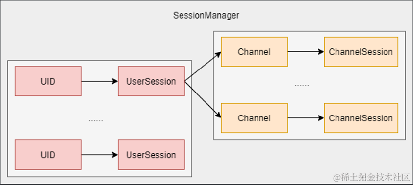 长连接建立起来后,会话维护在各节点的内存中。SessionManager组件负责管理会话,内部使用了哈希表维护了UID与UserSession的关系;UserSession代表用户维度的会话,一个用户可能会同时建立多个长连接,因此UserSession内部同样使用了一个哈希表维护Channel与ChannelSession的关系。为了避免用户无限制的创建长连接,UserSession在内部的ChannelSession超过一定数量后,会将最早建立的ChannelSession关闭,减少服务器资源占用。SessionManager、UserSession、ChannelSession的关系如图2所示。