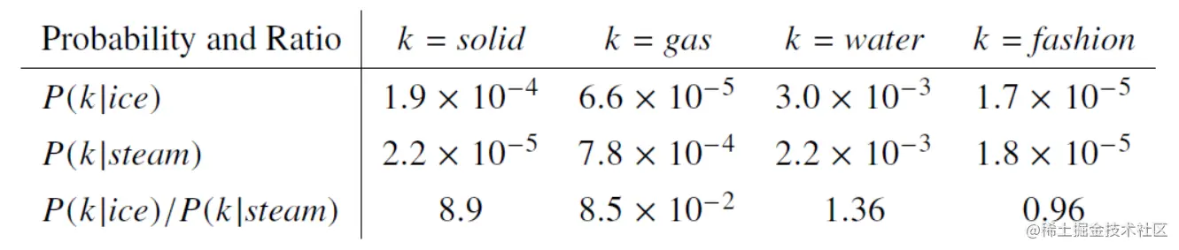 Glove 在上述基础上提出了共现概率 (Co-occurrence) 的概念,共现概率可以理解为上面条件概率的比例 Ratio。以下是原论文中的例子,给定中心词 ice (冰) 和 steam (水蒸气),可以通过不同的上下文单词 k 与中心词 ice、steam 条件概率的比例 Ratio(ice, steam, k) 判断它们之间的关系。
