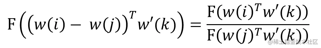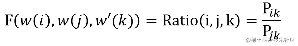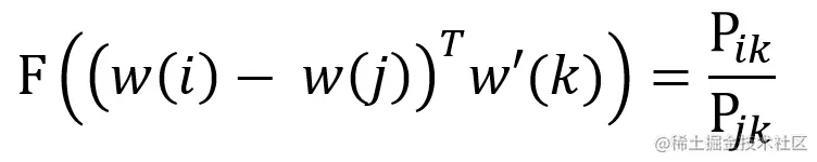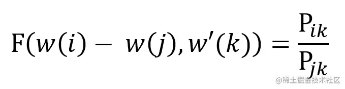 使用 w(x) 表示单词 x 的词向量,w'(x) 表示单词 x 作为上下文时候的词向量。则给定中心词 i,j 和上下文单词 k,Glove 希望词向量可以编码 Ratio(i, j, k)的信息,则会存在一种函数 F,使得下式成立。