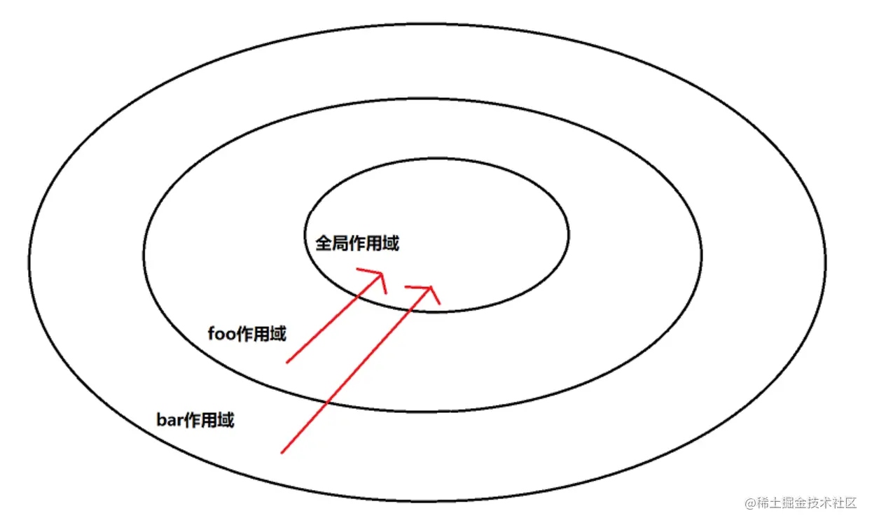 根据词法作用域的概念,更细来说是作用域。 bar函数拥有一个覆盖foo函数的作用域,在当前来说bar的作用域范围是最为之广阔的,bar能够访问foo的作用域甚至全局作用域,用图来表达一下我说的意思