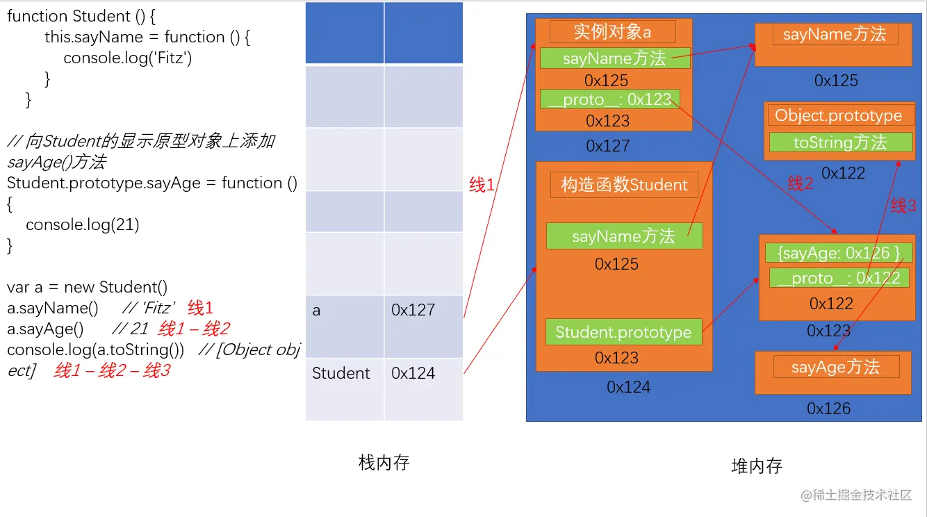 // 这样实例在调用方法时,可以通过原型链顺利找到该方法