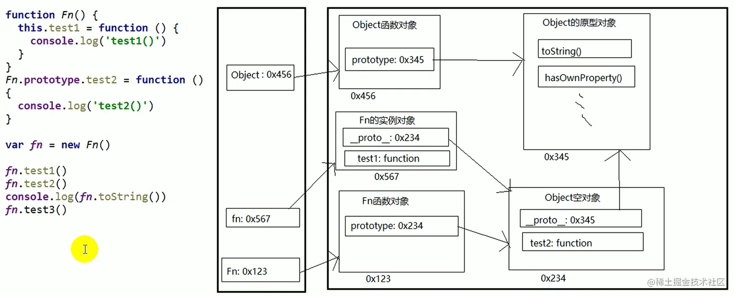 显式原型prototype存在于函数中,是函数的一个属性,它默认指向一个Object空对象(原型对象)