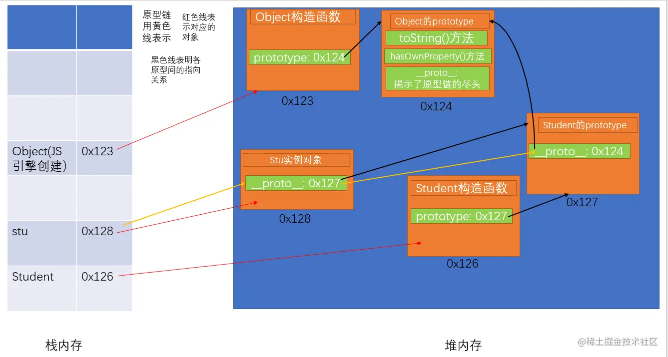 stu.__proto__ => Student.prototype => object.__proto__ => Object.prototype