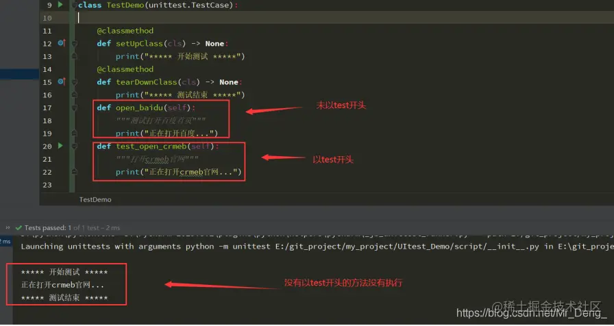 自动化测试中每条用例都是一个完成的流程 测试方法命名必须以test开头,因为TestCase批量运行测试用例的时候搜索以test开头的方法否则检索不到测试用例