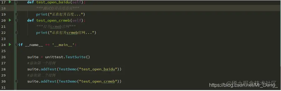 TestSuite测试套件 addTest方法使用: 实例化Suite类,suite = unittest.TestSuite() 添加用例,suite.addTest(ClassName(MethodName)) 说明:
