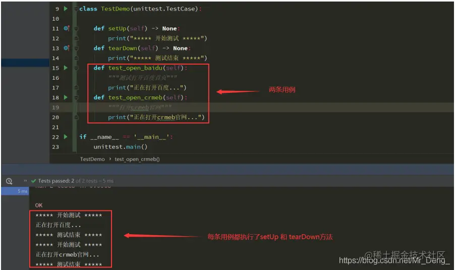 以上两个方法都继承TestCase类 setUp方法中做每条用例开始执行之前的操作,例如打开浏览器、登录等; tearDown方法中做每条用例结束之后的操作,例如关闭浏览器、退出登录、清除日志句柄等; 以上两种方法每次都在每条test用例前执行。