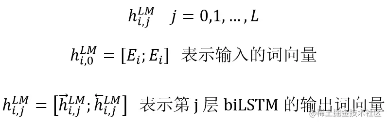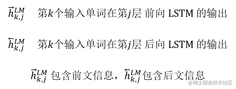 ELMo 的论文中使用以下符号表示双向 LSTM 中每一层对应第 i 个单词的输出,前向输出包含第 i 个单词之前的语义,后向输出包含了第 i 个单词之后的语义。