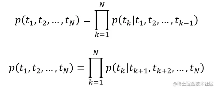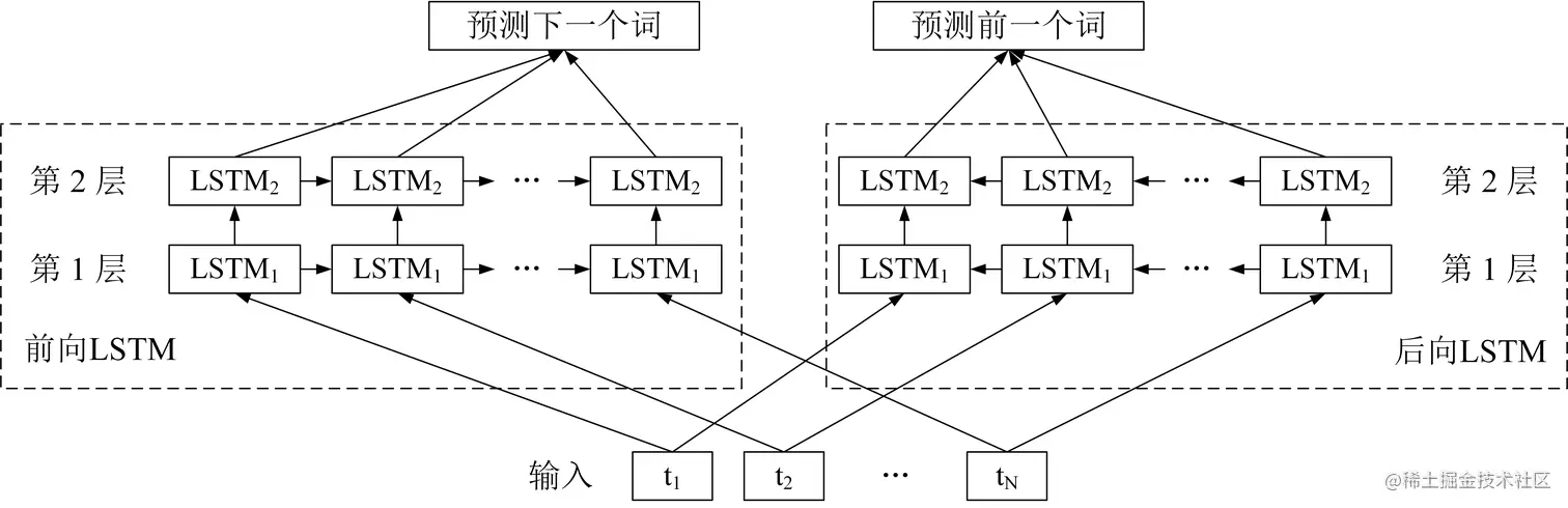 双向语言模型包括前向模型和后向模型,给定一个包含 N 个单词的句子 T = [t(1), t(2), ..., t(N)],前向模型需要通过前面的单词 [t(1), t(2), ..., t(k-1)] 预测下一个单词 t(k),而后向模型需要通过后面的单词,预测前一个单词。