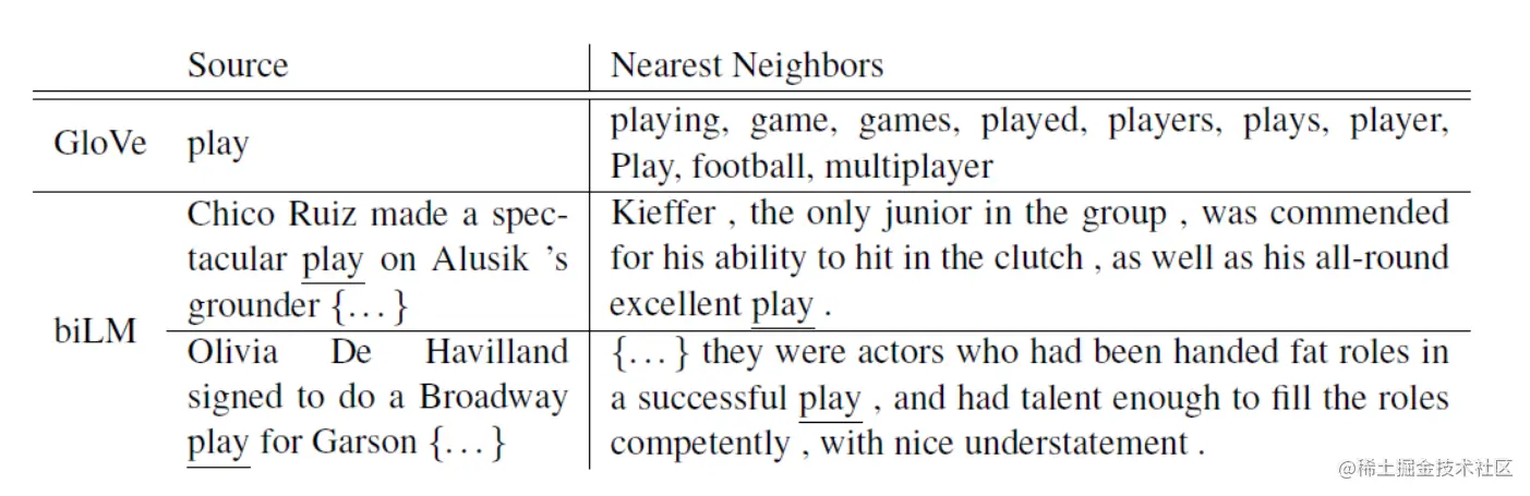这是论文中的一个例子,上面的是 Glove,下面两行是 ELMo。可以看到 Glove 查找 play 的最近邻,会出现“游戏”、“表演”、“运动”等相关的单词,可能与 paly 在句子中的实际意思不同。但是在 ELMo 中,可以看到第一个句子中的 play 是比赛的意思,其最近邻句子的 play 也是比赛的意思。而第二个句子的 play 都是表演的意思。说明 ELMo 可以根据上下文更好地得到一个单词的词向量。