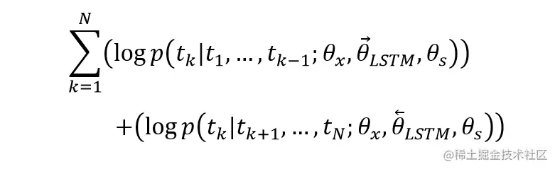 θ(x) 表示单词输入时候的词向量,这个词向量是固定的。θ(s) 表示 softmax 层,用于预测前后的单词。θ(LSTM,→) 表示前向 LSTM 的参数,用于计算 h(k-1,L,→)。θ(LSTM,←) 表示后向 LSTM 的参数,用于计算 h(k-1,L,←)。