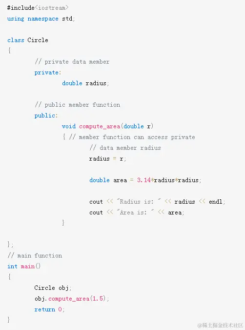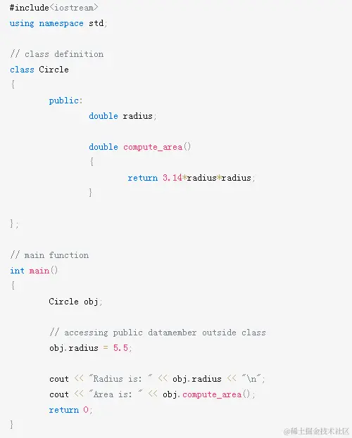 在上面的程序中,数据成员半径声明为public,因此可以在类外部访问它,因此可以从main()内部访问它。