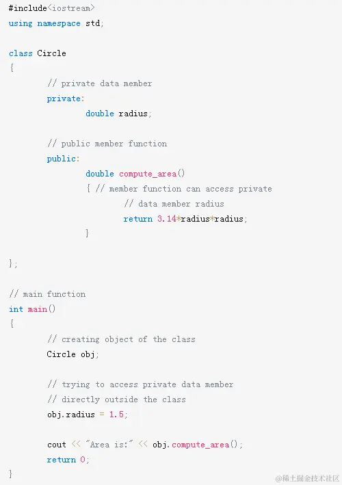 上面程序的输出是编译时错误,因为不允许我们直接在类外部访问类的私有数据成员。但是尝试访问obj.radius,radius是私有数据成员,我们得到了编译错误。