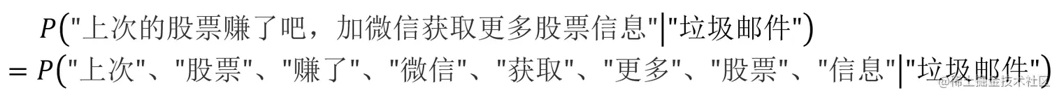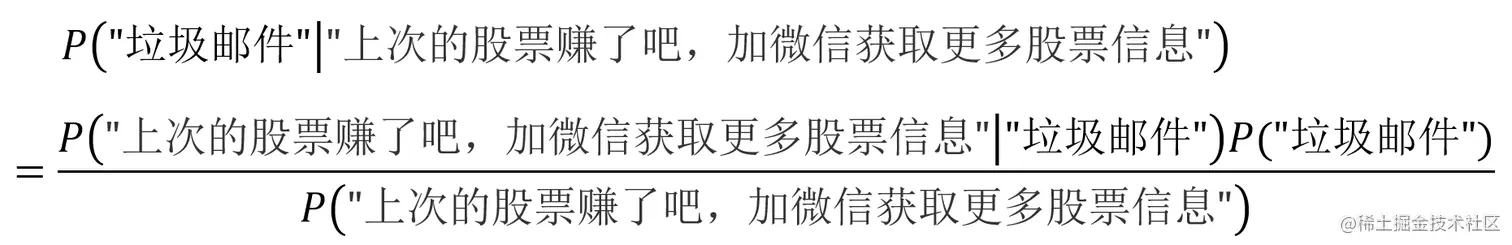 那么给定一封邮件 "上次的股票赚了吧,加微信获取更多股票信息",就可以根据贝叶斯公式计算出这封邮件属于垃圾邮件的概率。