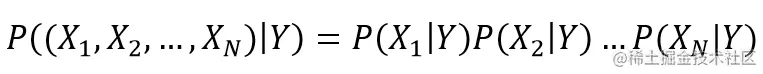 朴素贝叶斯采用条件独立性假设计算上面的公式,条件独立性假设是指,样本 X 的特征之间出现与否是互相独立的。