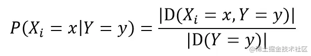 D(Xi=x,Y=y) 表示数据集中类标等于 y 且第 i 个属性值为 x 的所有数据,|D| 表示求数据集 D 里面数据个数。通过上面的方法,我们就可以计算出 P(Y) 和 P(X|Y),然后用于对比 P(Y|X) 的大小,从而找出样本所属的类。
