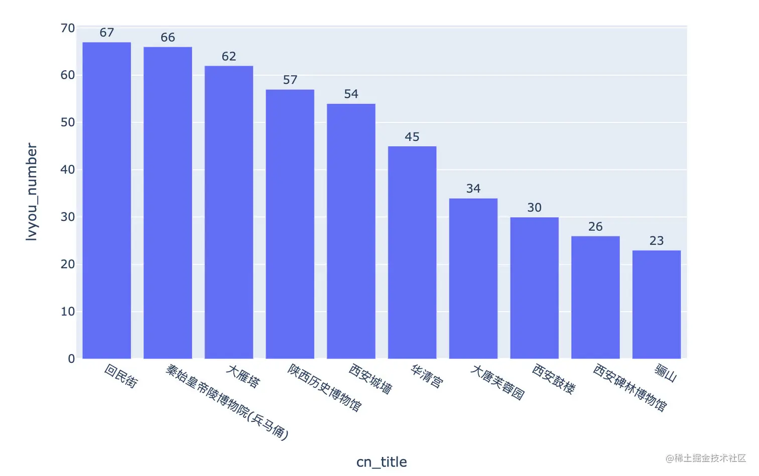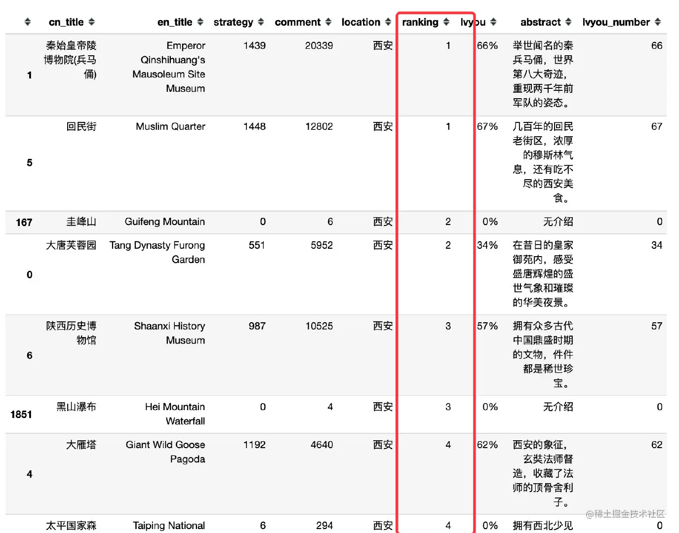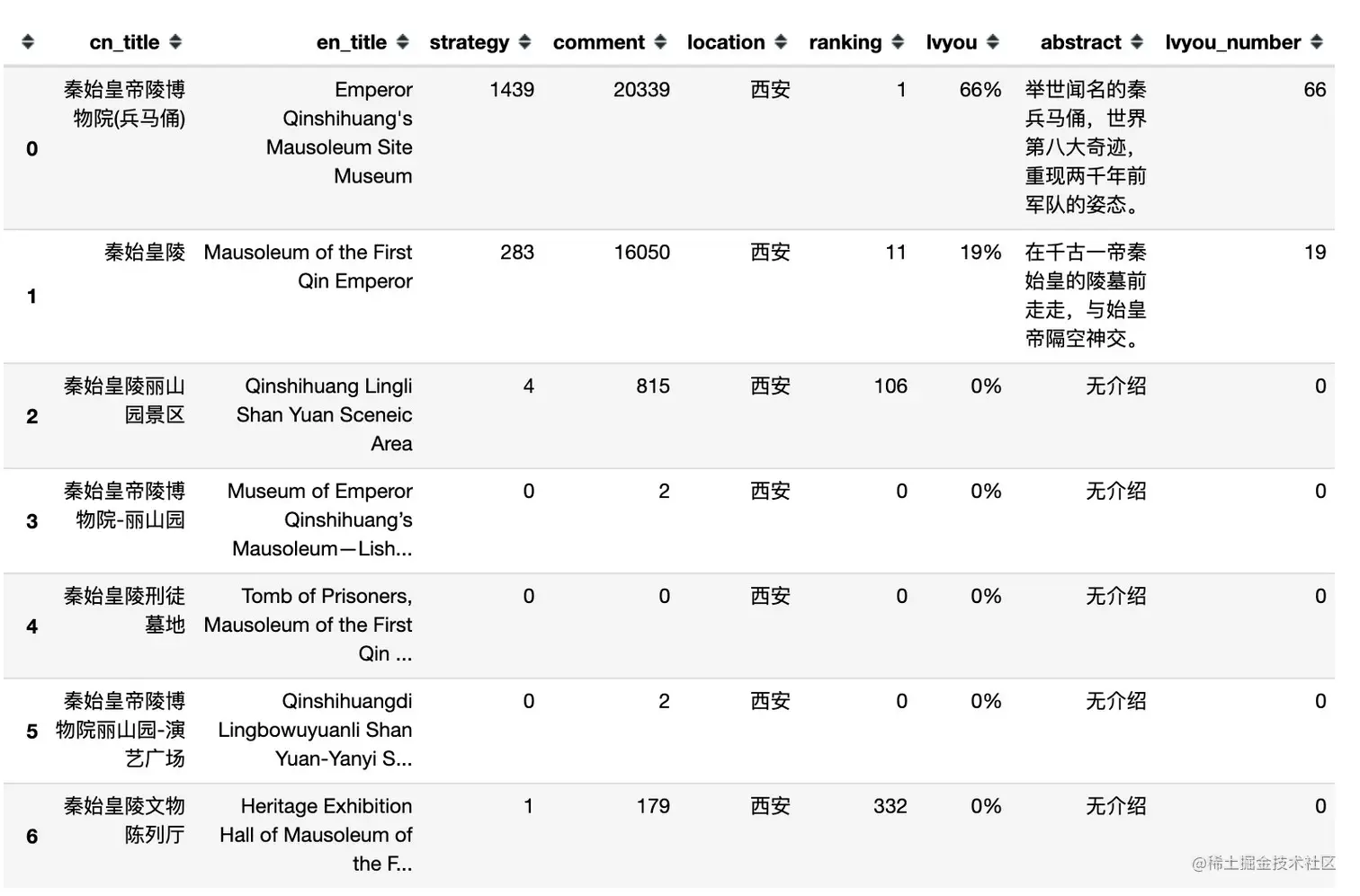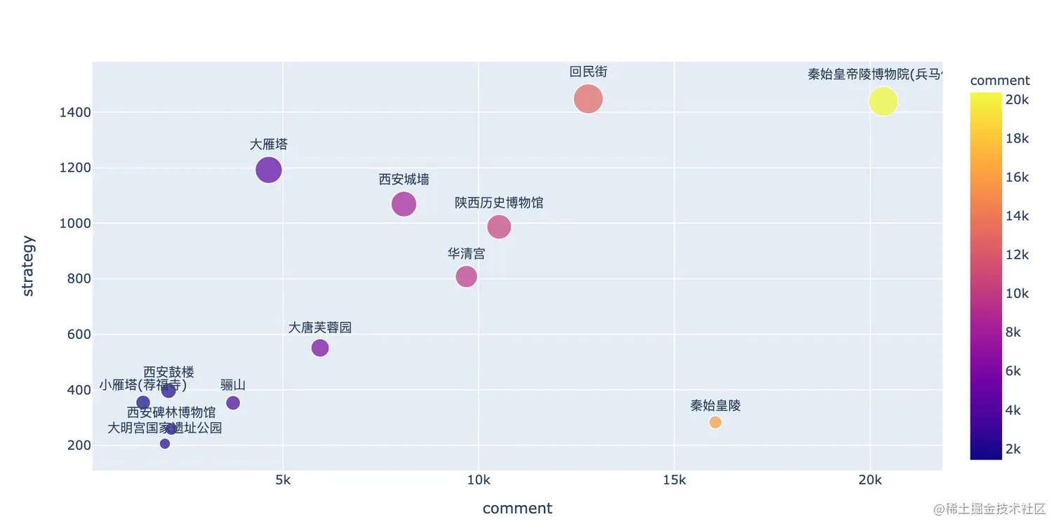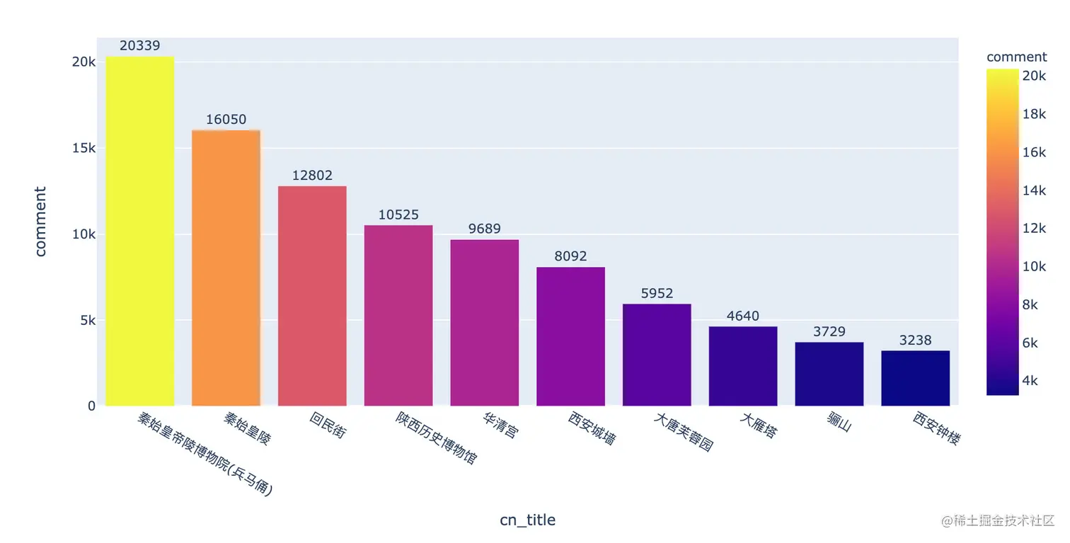 可以看到评论最火的是:秦始皇帝陵博物院(兵马俑),高达20339条评论,其次是秦始皇陵,16050条。的确是西安的热门景点。