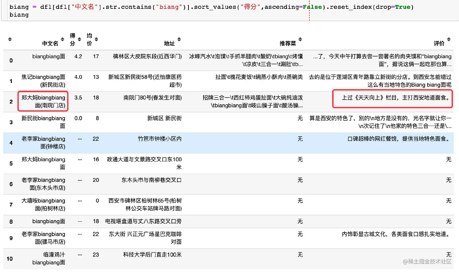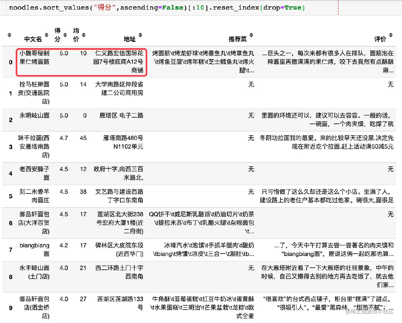 liangpi = df1[df1["中文名"].str.contains("凉皮")].sort_values("得分",ascending=False).reset_index(drop=True)