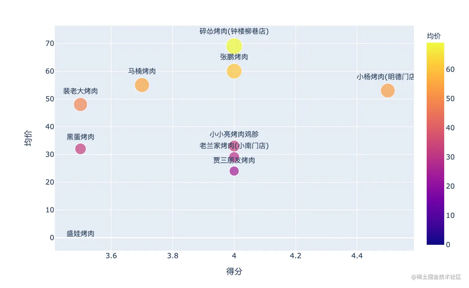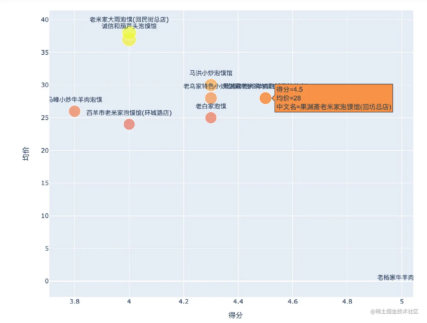 fig = px.scatter(kaorou[:10],x="得分",y="均价",color="均价",size="均价",text="中文名")