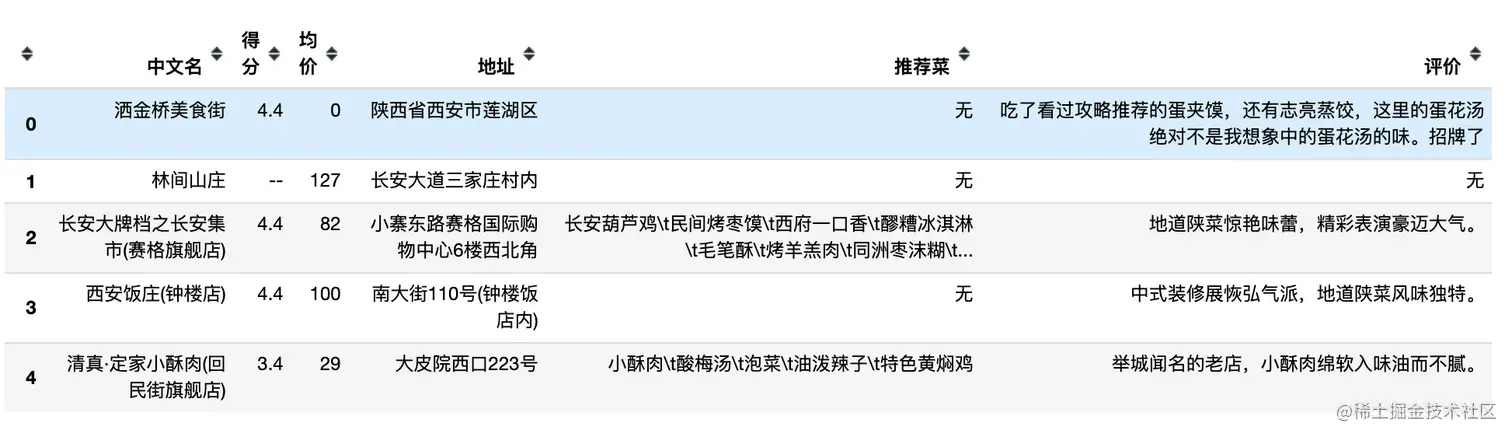 西安美食数据总共有1870条,看下前5条数据: