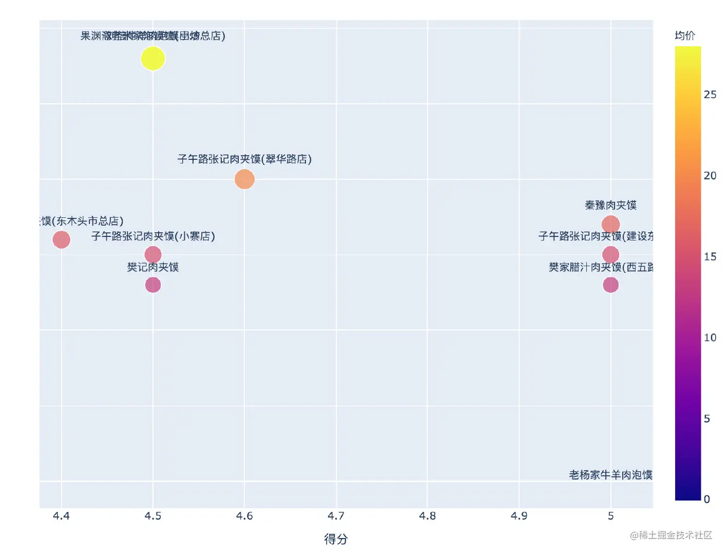 fig = px.scatter(liangpi[:10],x="得分",y="均价",color="均价",size="均价",text="中文名")
