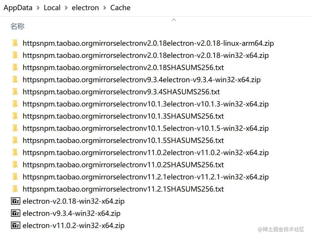 所以在Windows机器下,默认的缓存目录在~/AppData/Local/electron/Cache/,在本人的机器上,已经缓存的文件如下: