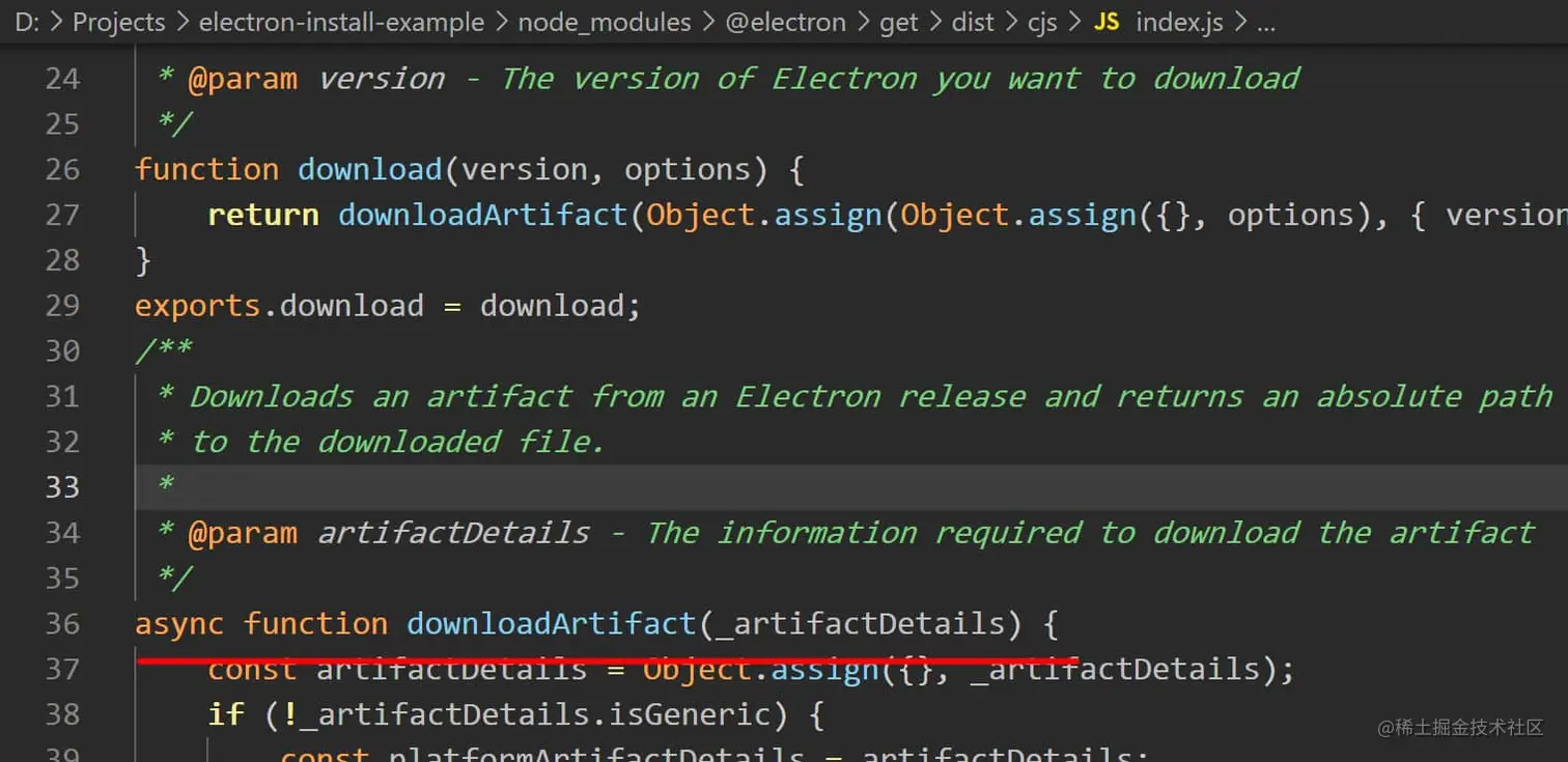 找到@electron/get的模块入口node_modules/@electron/get/dist/cjs/index.js,也很容易从中找到downloadArtifact的函数定义: