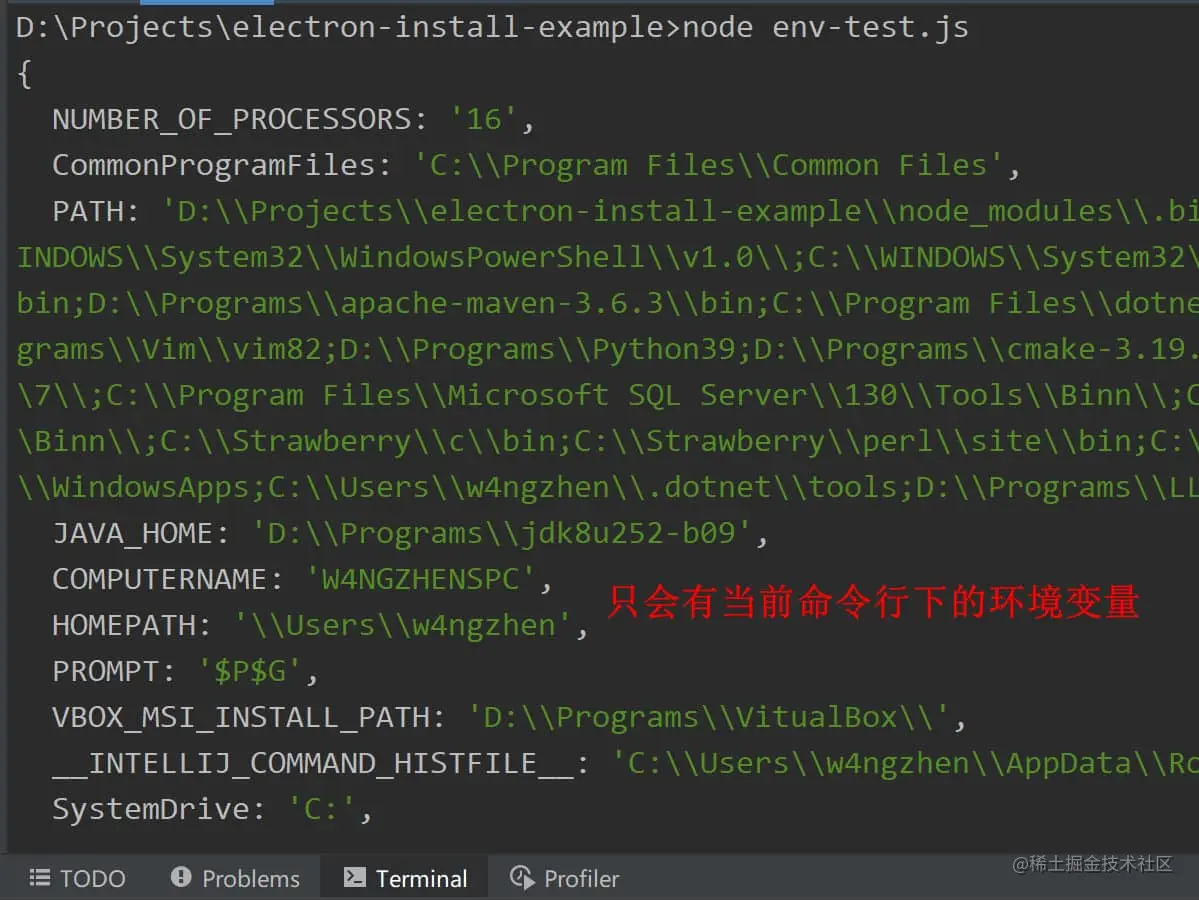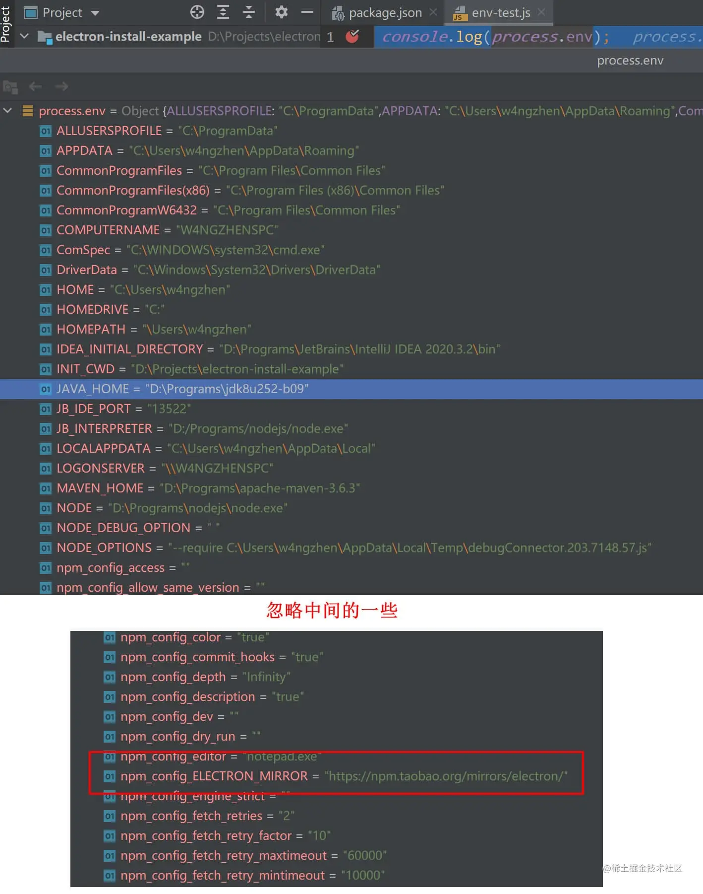 读到这里,也许有读者疑惑了,我明明是在.npmrc文件中配置的ELECTRON_MIRROR变量,而这里读取的明明是环境变量里面的值,怎么会有呢?如果直接使用node作为入口,那么确实不会有这些变量,但是通过npm运行就不一样了。这里用一个小例子来说明。