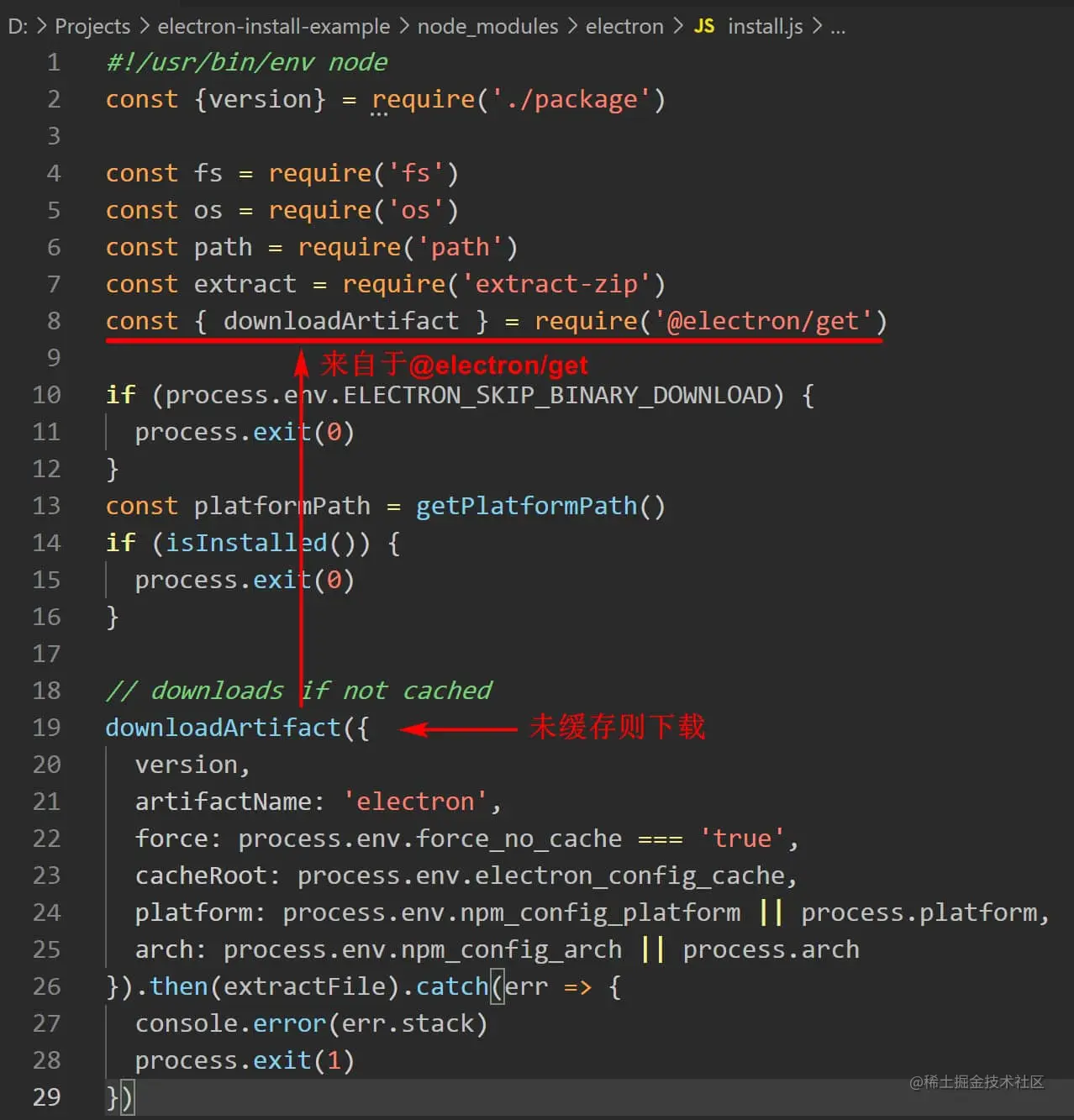 代码特别容易理解:在没有缓存文件的时候,会使用@electron/get提供的downloadArtifact函数,进行Electron二进制制品的下载。