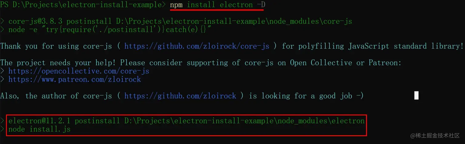 最后,使用命令行安装Electron:npm install electron -D。在短暂的npm包安装后,我们会发现会卡在一个地方: