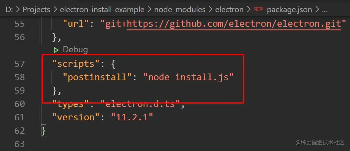 进入项目根目录下/node_modules/electron/(后续除特殊情况外,提到的目录路径都是统一相对于项目根目录)目录中,查看package.json文件中的scripts脚本节点: