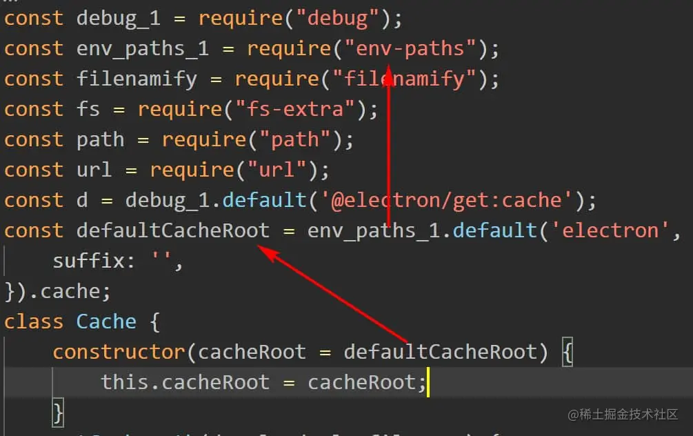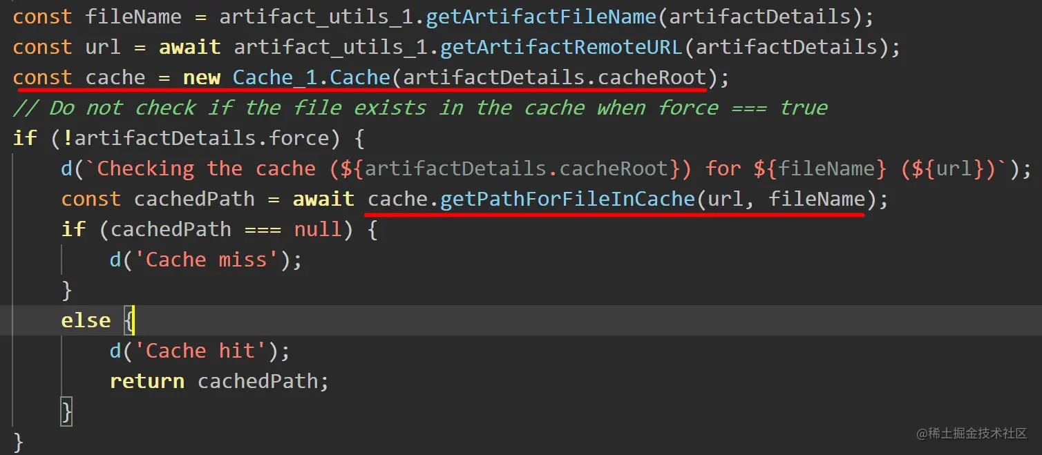 有的读者看了上述的远端下载可能会说,我的机器就在内网环境,内网也没有镜像让我来写,我该怎么下载呢?实际上,@electron/get也不会完全从远端下载制品。它在下载的过程,会优先进行本地缓存文件的查找,如果已经存在了缓存好的制品,自然也就不会从远端下载了。那么这个查找缓存的过程是怎样的呢?或者说,@electron/get会从本地哪个目录去查找呢?让我们回到@electron/get/dist/cjs/index.js脚本的downloadArtifact函数中,看该部分: