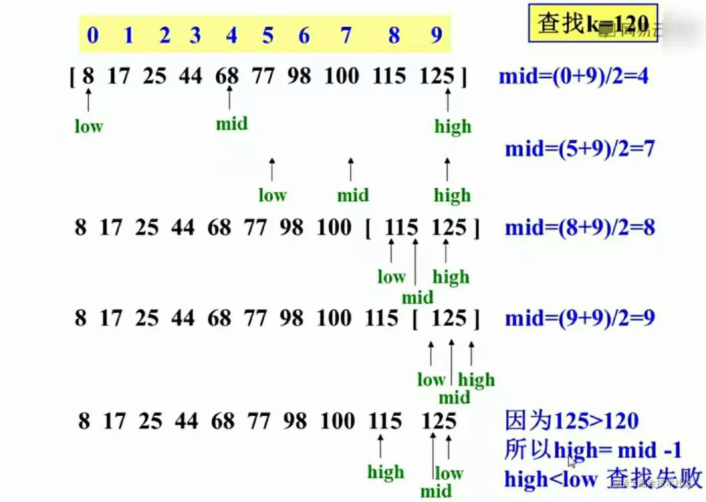 int low = 0, high = n-1, mid; //初始化low是0, high是n-1