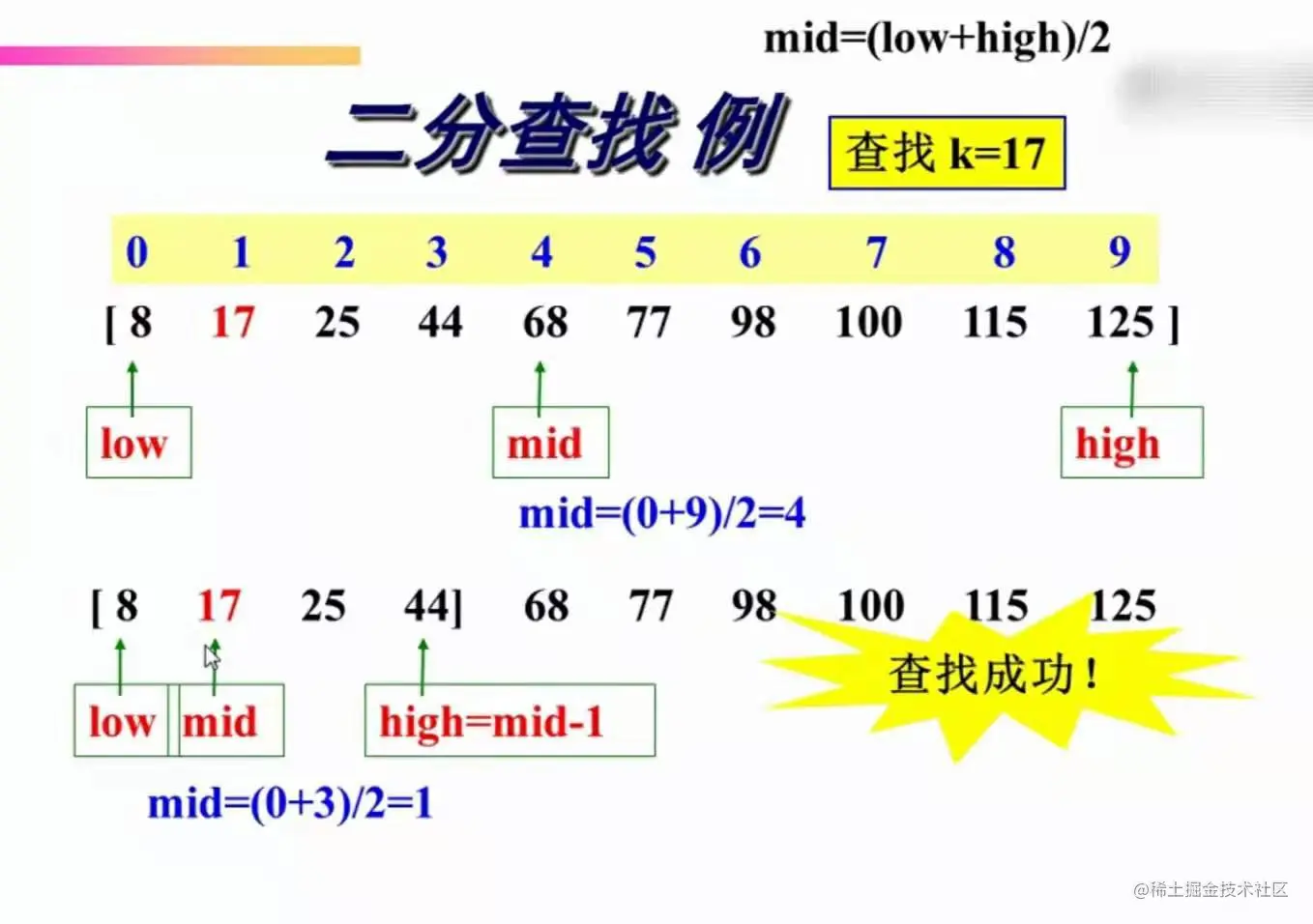 low 下界 ; high 上界; mid = (low + high) / 2 不进位取整