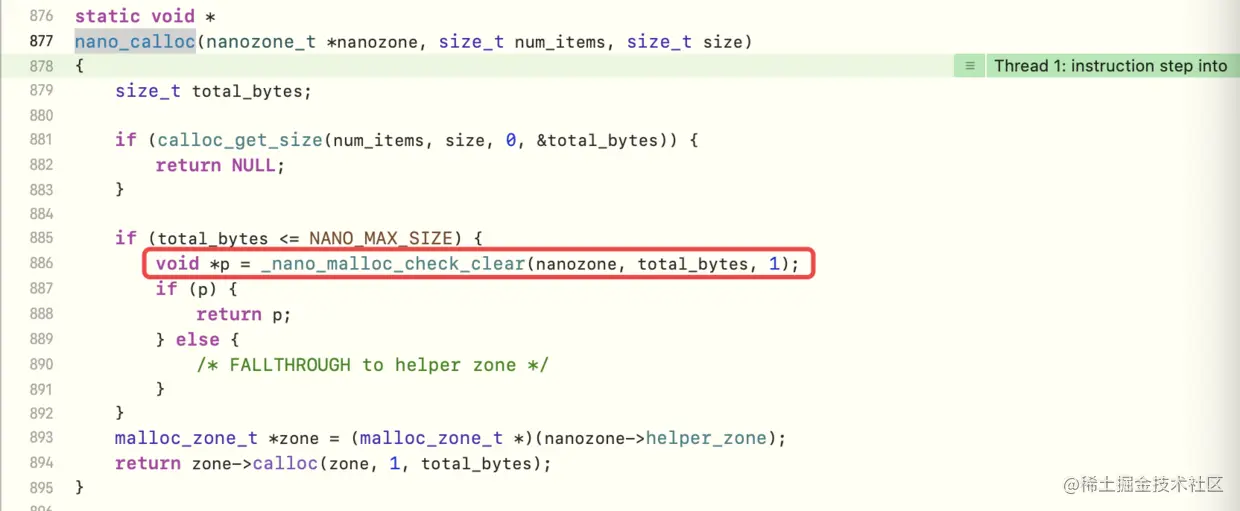 _nano_malloc_check_clear方法,进入segregated_next_block源码,这个方法主要就是获取内存指针- 但是如果是第一次走到
