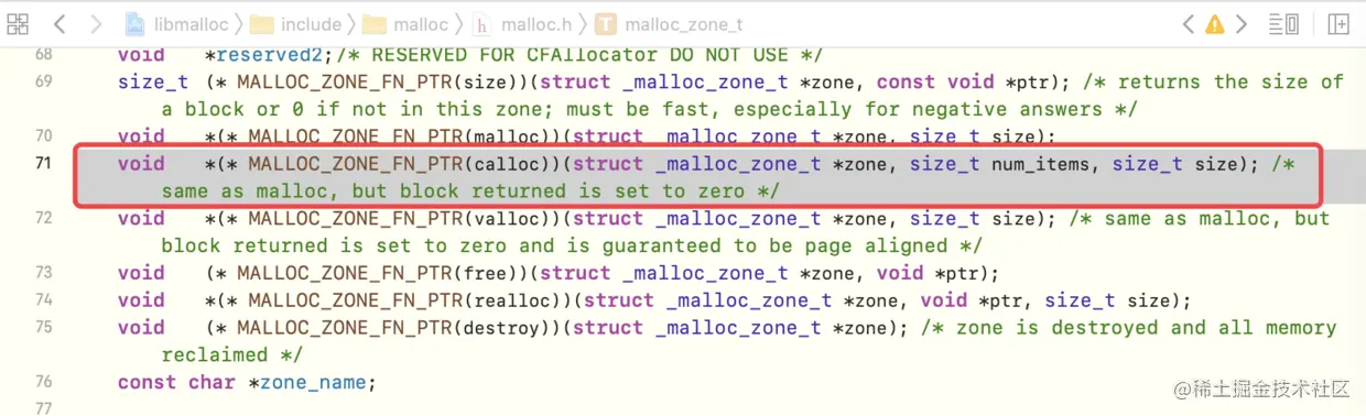 zone->alloc的源码,发现是一个calloc的声明,到此,源码就无法继续跟进了
