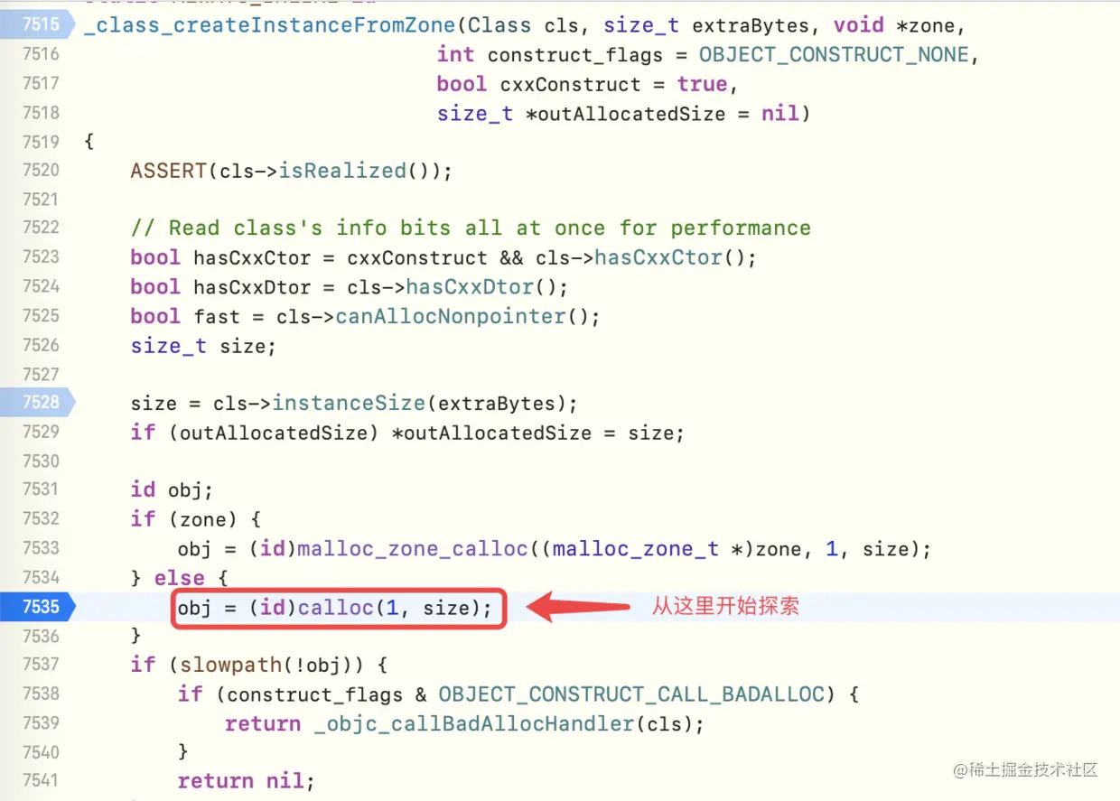 obj = (id)calloc(1, size);操作,涉及的方法顺序是alloc --> _objc_rootAlloc --> callAlloc --> _objc_rootAllocWithZone --> _class_createInstanceFromZone