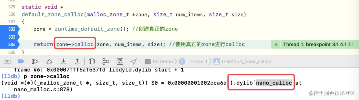 malloc_zone_calloc中的关键代码,即ptr = zone->calloc(zone, num_items, size);处,加一个断点,然后运行 -