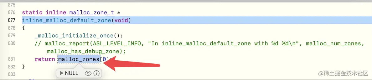 inline_malloc_default_zone的源码实现,通过查看malloc_zones的值发现是NULL,可以得出,此时的zone还未赋值