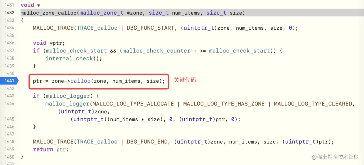 malloc_zone_calloc的源码实现,关键代码是1441行的zone->calloc- 其中