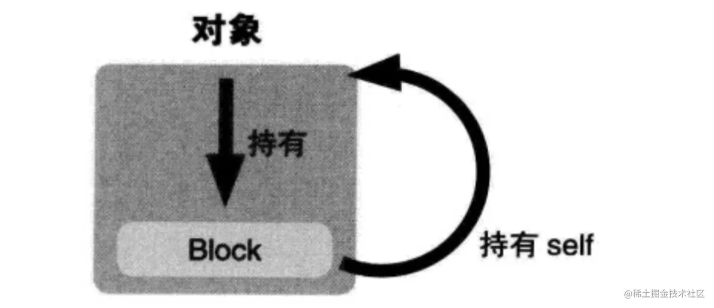 同理,Block 发生循环引用就是,Block 持有(强引用)对象,对象持有(强引用) Block,导致对象 A 在堆中将要被释放时,发现还持有 B 对象,同时 B 对象也持有 A 对象,僵持在那里,谁都无法被释放。如图: