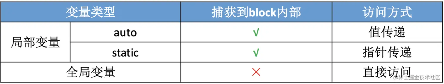 全局变量 不能也无需捕获到 Block 内部,因为全局变量是存放在全局静态区的,直接访问就完事了。缺点也是内存开销大。