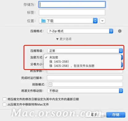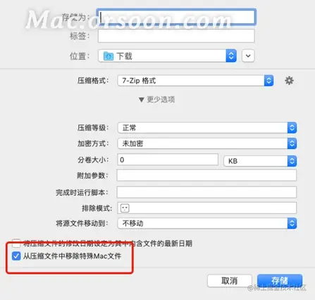 接下来最为重要的是勾选最下方的“从压缩文件中移除特殊Mac文件”,顾名思义,它能够帮助大家,让Windows系统无法识别的Mac特殊文件不包含在压缩文件中,防止Windows系统解压缩时出现错误,无法解压缩文件。