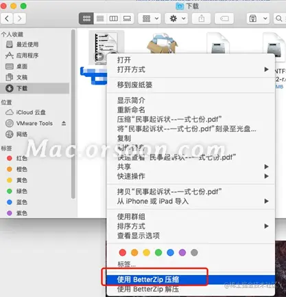 第二种方法小编比较常用,直接右键选择文件,然后在右键菜单中,选择“使用BetterZip压缩”,如下图2。