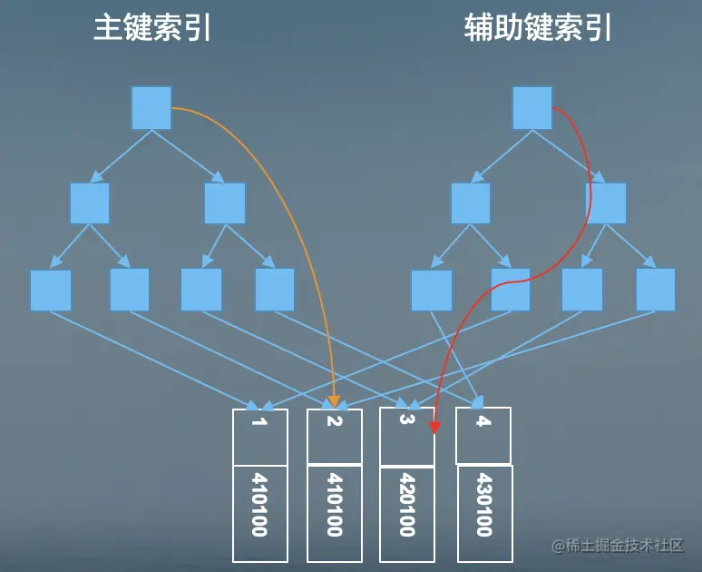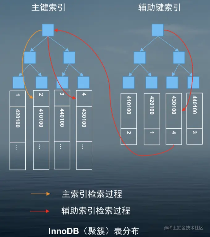 1、InnoDB 聚簇索引和辅助索引(非聚簇索引)的对比图示
