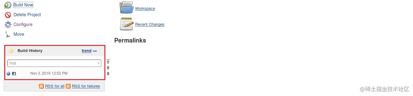 **第 4 步:**保存项目,您将进入项目概述页面。在这里,您可以查看有关项目的信息,包括其构建历史。