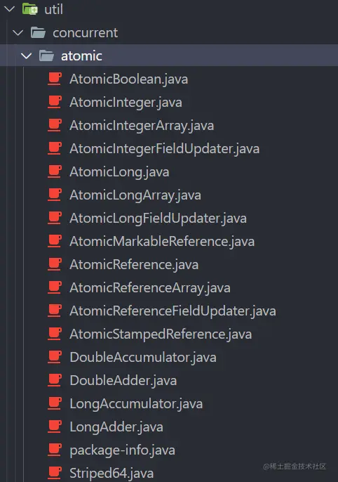 2)对于原子性,我们可以使用 锁 和 java.util.concurrent.atomic 包中的原子类来保证。(给萌新解释一下,java.util.concurrent,简称 J.U.C,就是一个包,也成为并发包。现在网上大部分博客都会直接说 JUC,对萌新不是很友好),我们可以看看 juc.atomic 中有哪些类: